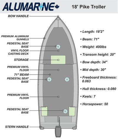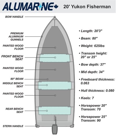 Yukon Fisherman BT or SC 80" Beam STANDARD FEATURES: 1" Through Hull Drain Aluminum Console - SC Only Small Splash Well Casting Deck w/...