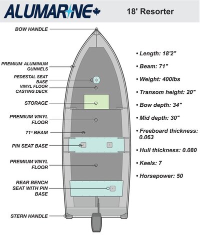 Resorter STANDARD FEATURES: 1" Through Hull Drain 2 Cross Benches Casting Deck w/ Enclosure (Vinyl) Quick Disconnect Vinyl Floor Boards...