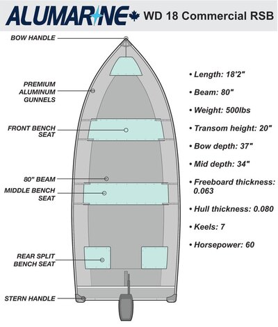 WD 80" Beam STANDARD FEATURES: 1" Through Hull Drain 3 Cross Benches Small Splash Well Triangular Bow Seat OPTIONAL EQUIPMENT:...