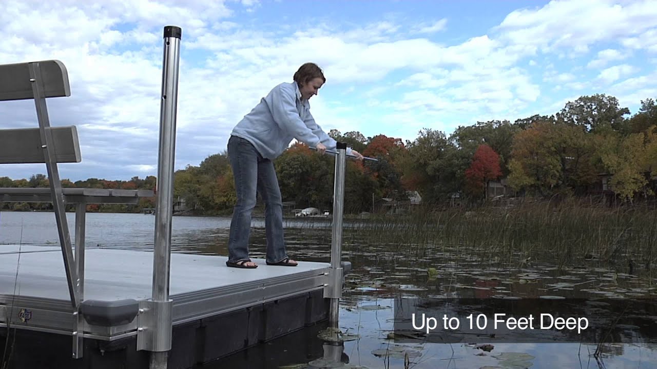 Anchoring solutions FLOE offers an aluminum guide-pole and bracket system to secure and stabilize dock sections in depths up to 10 feet. The guide pole goes through a bracket on the dock with the auger end screwing into the lake bottom. As the water fluctuates, the dock raises and lowers along the guide poles, always ensuring you are high and dry. Pilings and custom piling loops or a cable and anchor system can be used for floating dock sections in water depths greater than 10 feet. |