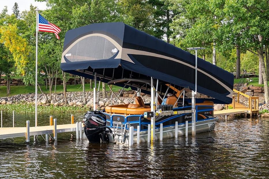 FLOE boat lift canopies offer greater boat protection than competitors lifts with their extra deep fabric and framework. Your canopy will not blow in or up and will keep your boat fully covered. The upscale style with tailor-fit fabric has a refined look and is held taut with the exclusive Quick-Clip™ fabric attachment system. |