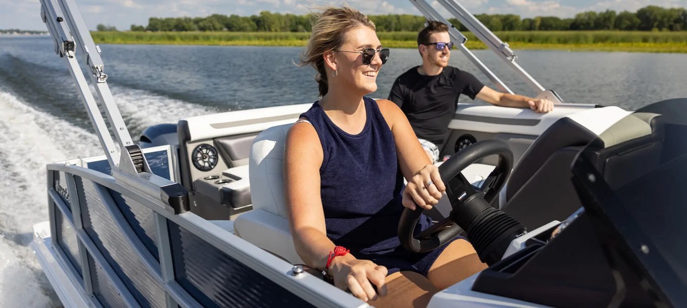The contrasting style of the FunDeck steering wheel tells you this is not your average deck boat. Precisely navigate the water with the best of all worlds with wave cutting performance, a watersport wake and wide-body stability.